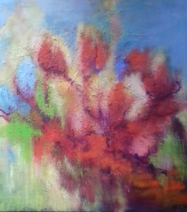 2011Vrije impressie van bloemen op doek, verf in verschillende lagen dik opgezet.